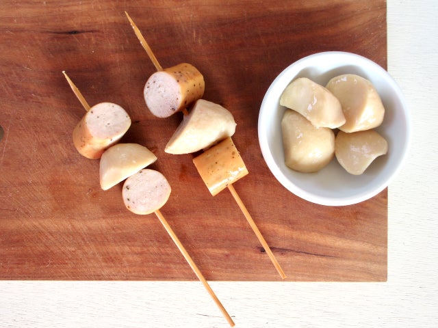 サラダチキンバーは、一口サイズに切り、里芋と串に刺します。串には食べやすいだけでなく、食材に早く火を入れる効果もあるのです。