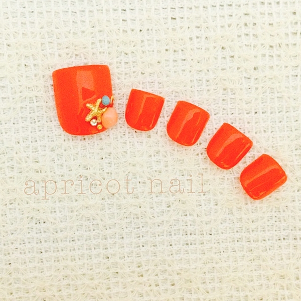 肌なじみがよいオレンジはフットネイルにオススメのカラー。ゴールドラメやパーツなどと相性が良く使いやすいカラーです。