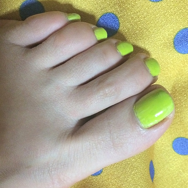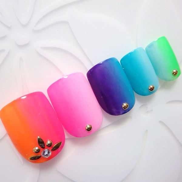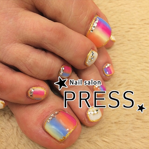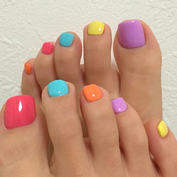 ランダムな縦グラデーション。夏っぽい明るいビタミンカラーを使ったフットネイルです。
