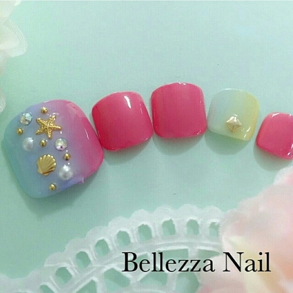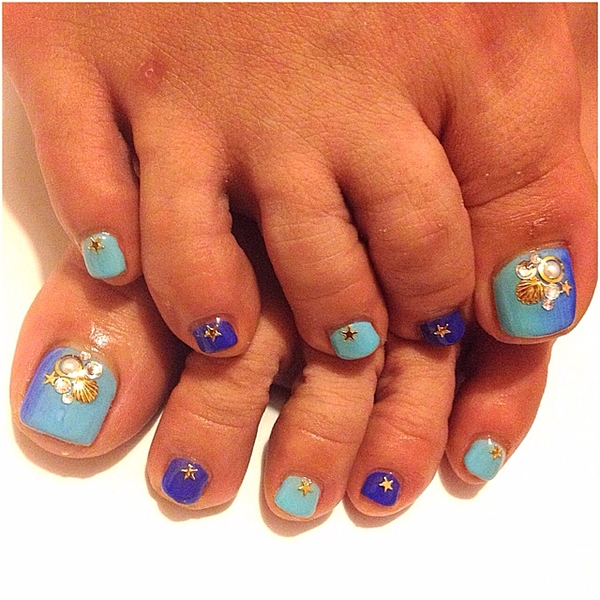 昨年に引き続き人気なのはシェルやヒトデモチーフのパーツを使ったフットネイル。キラキラした海みたいなホロにゴールドのモチーフが映えます。