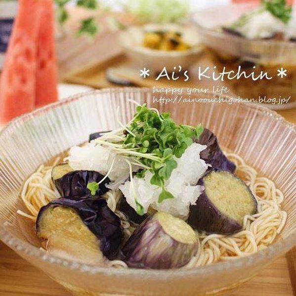 揚げたなすを大根おろしと一緒に、そうめんの上にのせてつゆをかけるだけのレシピです。