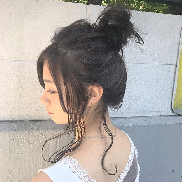高めにお団子を作ってゆるくくずし、後れ毛と前髪をサイドに流すだけの簡単なアレンジ。
