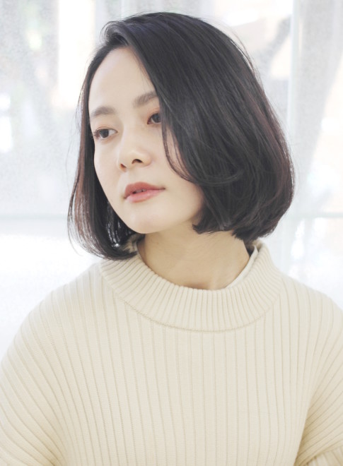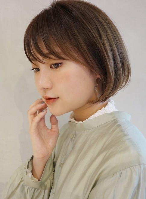 顎ラインでカットしたシンプルなボブスタイルです。丸みのあるフォルムに仕上げることで、シンプルな中にも、大人の可愛げをプラス。アッシュ系カラーで透明感のある髪色に。