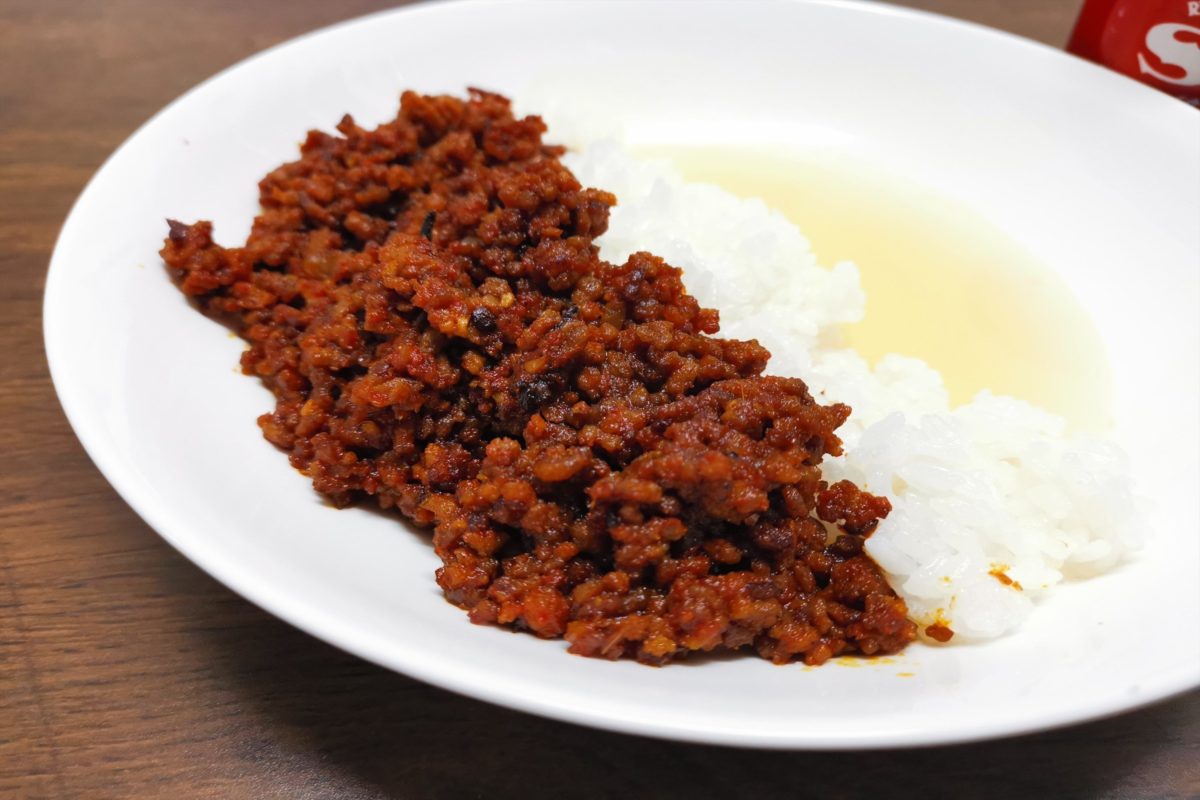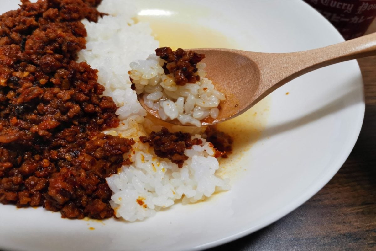ひき肉のカリカリ感とご飯の柔らかさだけでなく、スープが入ることでサラサラしたカレーのような食感にもなる絶品カレーの完成だ。