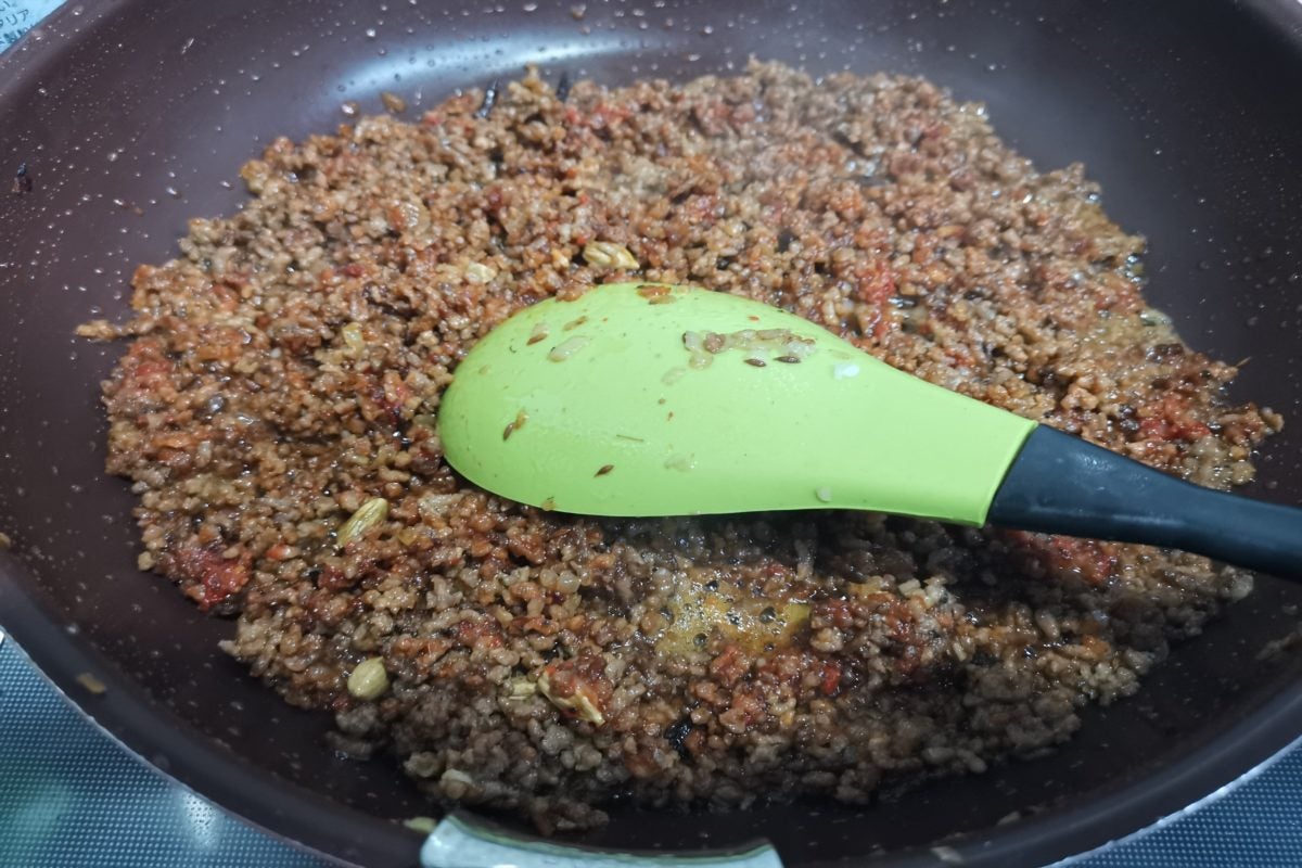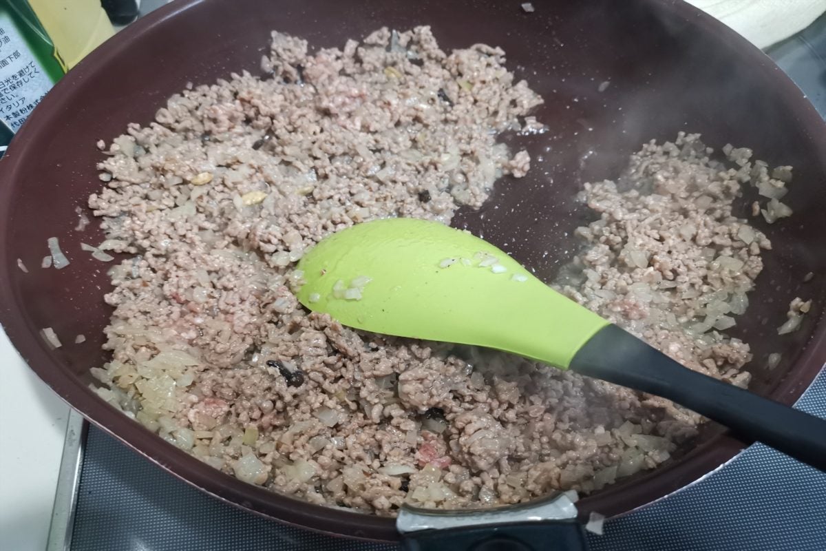 ちょっと炒めすぎかな? と思うぐらいしっかり炒めよう。ひき肉から脂の泡が出てくるぐらいが目安だ。