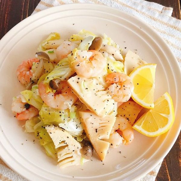 たけのこの食感やエビのプリプリ感、そしてキャベツのパリッと感が合わさった絶品料理です。サラダ感覚で食べられる一品。