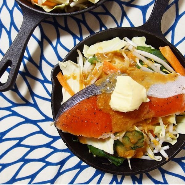このレシピはキャベツやにんじんなどの上に鮭をのせて、オーブンに入れる人気の料理です。味噌やバターをのせてコクを出しています。