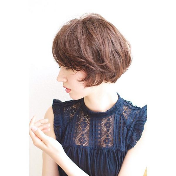 長め前髪を合わせた前下がりショートボブに、無造作風パーマを施した大人っぽいヘアスタイルです。