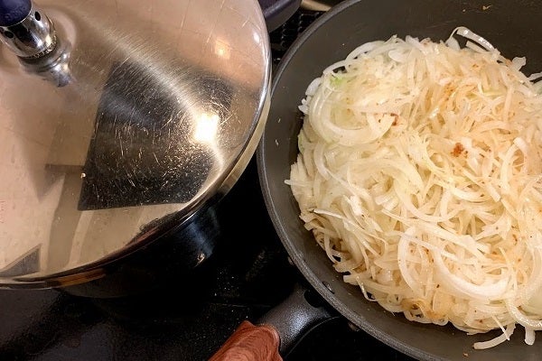 さあ、覚悟はいいですか?ここからトータル40分の勝負です!ルーを使ったり、ペーストを使ったりしますが今回は覚悟を決めて「オニオンと対峙」してください。食べた時にわかります。最高のコクと香りが待ってます!