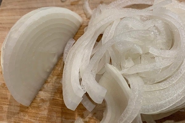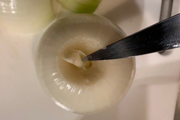 そして包丁の先で芯の部分をえぐり出します。芯の部分は成分が強いので玉ネギにしろニンニクにしろ、香りが強く雑味になりやすいです。また胸焼けの原因にもなるそうなので丁寧に取り除きましょう。この段階で処理しておくと、半分に切ってから包丁を入れるよりも少しだけ手間が省けるのと、根っこと一緒にV字に刃を入れるよりも玉ネギがバラけにくい利点があります。みじん切りにする際に根を残すとき以外はこの方法がおすすめです。皮を剥き後の玉ネギが丸ごと使えるようになります。今回は縦半分にカットしたらひたすら薄くスライスしてください。