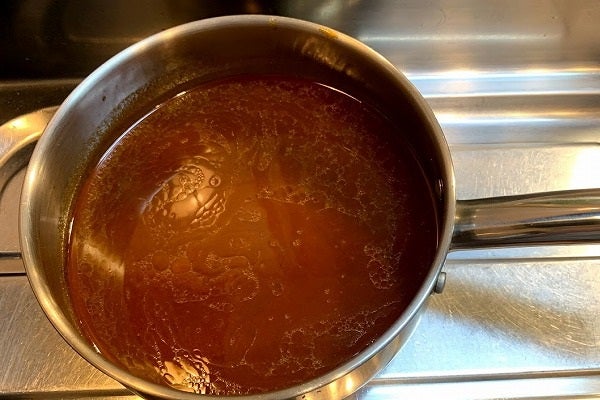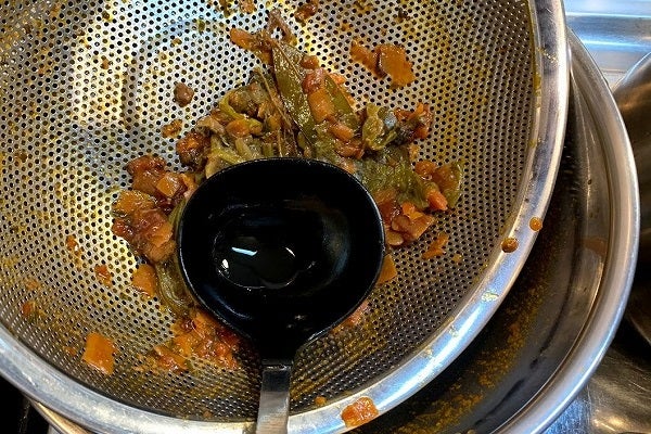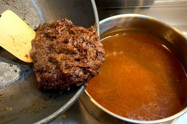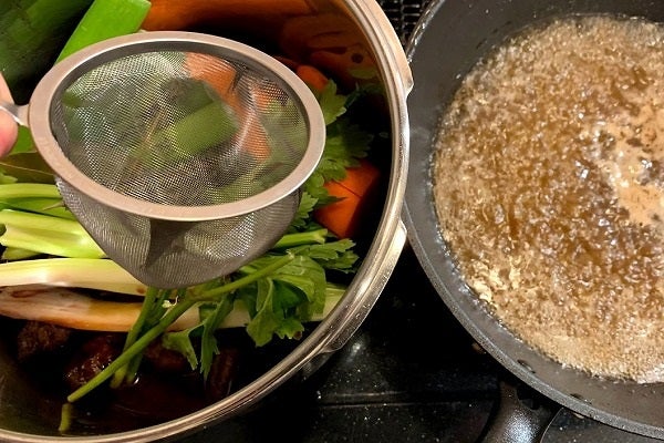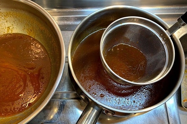 木ベラで底を掻きながら旨味をこそぎ取り、液体が2/3程になったら鍋に移します。この時に茶漉しを使って焦げなどは取り除きましょう。