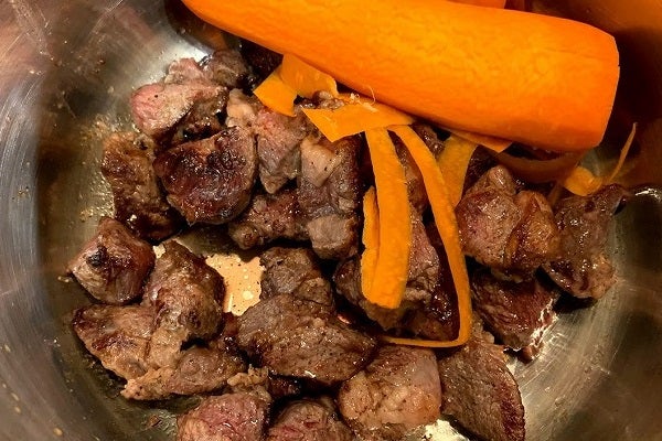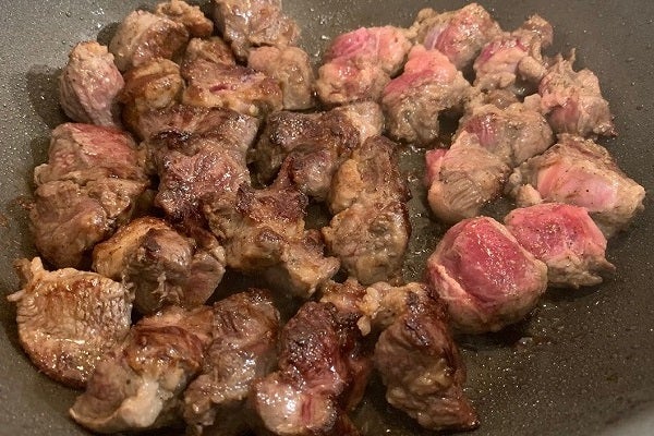 これくらいの量ですと返しているうちにトングが熱くなってきますので、ここで一度弱火に下げます。お肉の片面が焼ける頃にはフライパンは結構温度が上がっているのです。返したらなるべく全面をコンガリ狐色に焼きましょう。程よく焼けましたら圧力鍋の中に移して行きます。