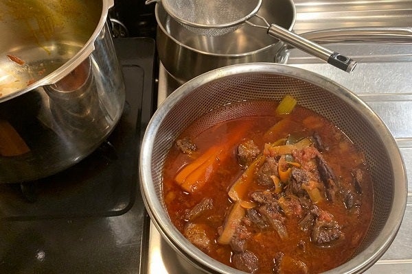 8.圧力鍋は30分たったら火を止め、圧力(蒸気)が抜けるのを待ちます。蒸気弁が下がったら蓋を開け、大きめのザルボウルと「味噌汁用の濾しアミ」を使って、スープを「パッセ(=passer)」して行きます。フレンチでは「濾し器を使ってフォンや煮汁など液体を濾す作業」をそう呼びます。まず初めにザルボウルに鍋の中身を静かに空けます。お肉がトロトロになっていますので崩れないように優しく空けます。