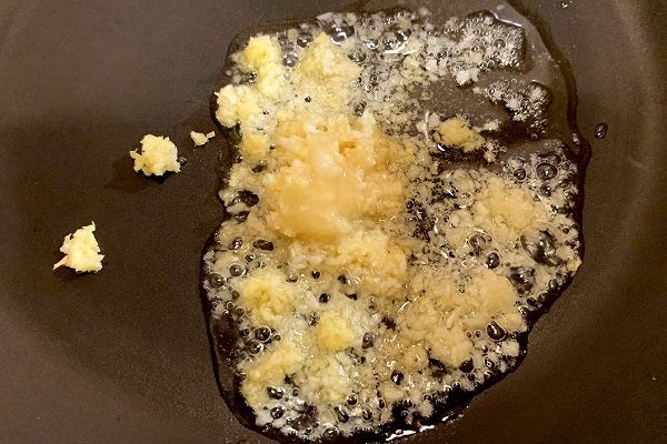 5.今回はフライパンを一度洗います。ここから長期戦に入るからです。弱火でよく水分を飛ばしたフライパンに、飴色玉ネギ用のバターを落とします。そして「アッシェ」したニンニクとショウガを投入。そのまま弱火でじっくり炒めてください。