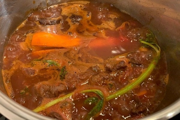 もう一度湧いてきたら圧力鍋の蓋を閉めます。蒸気を満ちて圧力がかかったら、弱火にして30分です。恐らく飴色玉ネギと一緒くらいに仕上がるはずです。
