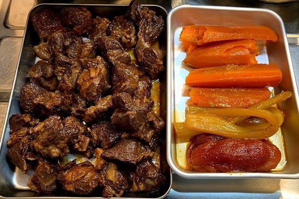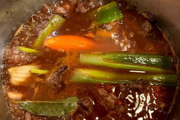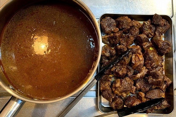 「フォン・ド・ヴォー」とはそもそも「仔牛の骨」から取った出汁なのでありますがそんな物を一般家庭で手に入れてオーブンでローストして作れるわけもなくどうしたものかと考えを巡らせますが「ルー」は使うに越したことはなくその中でも経験上で厳選した「ルー」をご推薦しました。「フォン」いわゆる出汁に関しては今回「コンソメ」を取る部位である「スネ肉」を使い豊富なコラーゲンと共に「旨味」も引き出しつつ、出汁としてしっかりと香味野菜も使うことで、主婦の皆様には怒られてしまいそうな工程を交えつつ、フレンチっぽいことが出来たらと思う所存でございます。