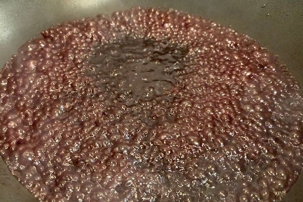 4.お肉を焼いて旨味の残っているフライパンに、赤ワインを入れ「デグラッセ」します。※デグラッセ=鍋底に付いた焦げ・旨味を水、ワイン、ブイヨンなどで煮溶かすこと。