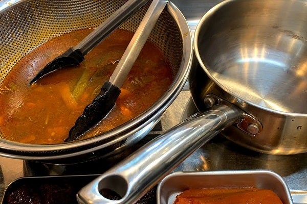 仕上げ用の手鍋などを用意し、目の細かい「味噌濾し」を使ってさらに綺麗な「フォン」にします。ここまで来たら完成は間近です。