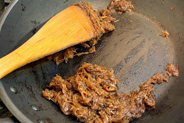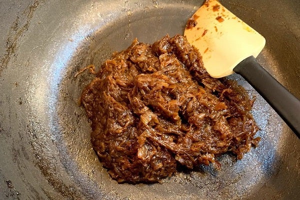 7.さて「飴色玉ネギ」に戻ります。ここから30分ほどです。かき混ぜているうちに、鍋底の水分が半量ほどになってきます。ここからは目が離せません。玉ネギから水分が出切ってしまうと一気に蒸発スピードが上がります。この蒸発とともに辛味成分も蒸発します。そしてショ糖の成分がさらに甘味を持つブドウ糖と果糖に分解されますので、玉ネギの甘さを最大限に引き出すことができるのです。