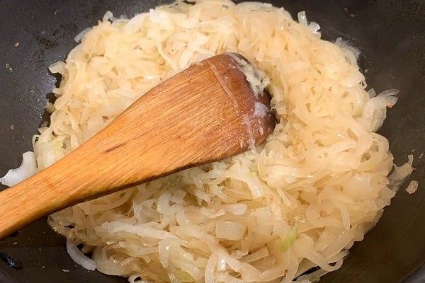 初めのうちは頻繁にかき混ぜなくても心配入りません。しばらくは酵素の力を引き出しながら、しんなりしてくるのを待ちます。次第に鍋底が水分で満たされて行きます。ここでもまだまだ大丈夫。時折かき混ぜながら水分を均一にしてください。一部が焦げるのを防ぐのと、玉ネギから均一に水分を出して行きます。フライパンを火にかけてからここまでで10分です。