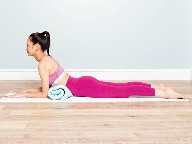 背筋を利かせたコブラのポーズは、肩もすくまず胸の中心が前向きに。腰幅に開いた足の甲で床を押す力もアップ。