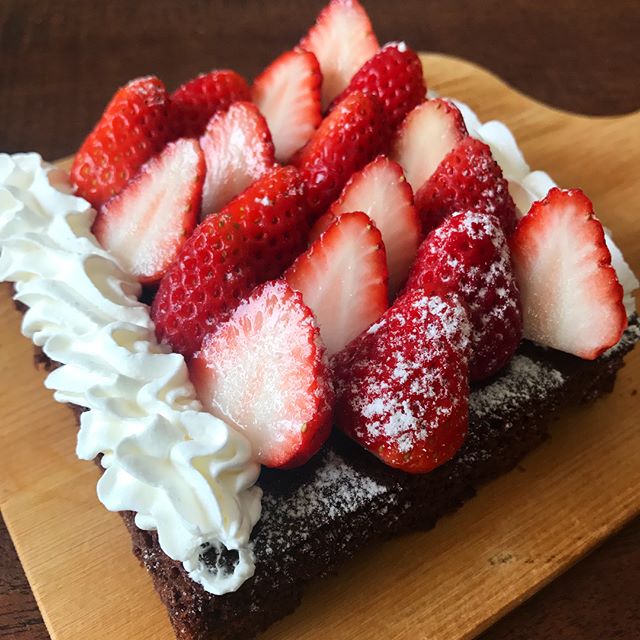 数種類の食材をトッピングすることで、チョコレートケーキの上にお花畑ができたような雰囲気になりますよ。