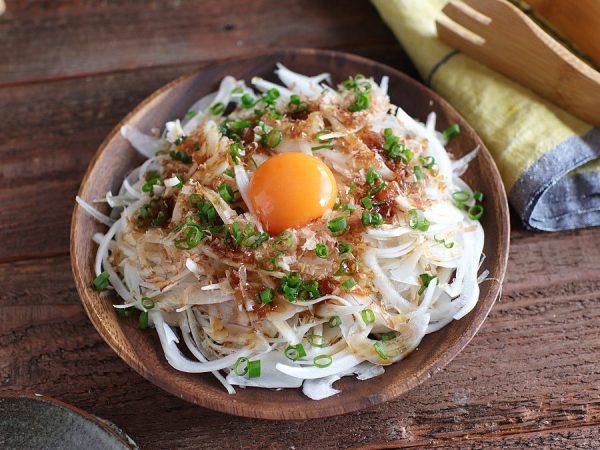 簡単!新玉のかつお節サラダの黄身のせ
