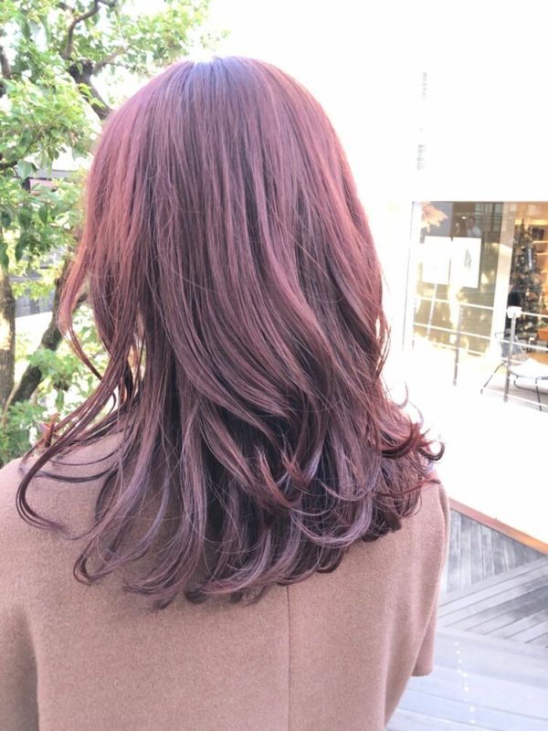 ピンク系のフェミニンなヘアカラーながらも、暗めで大人女子も挑戦しやすい落ち着いた髪色です。