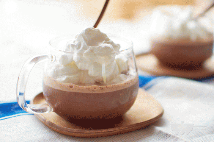 チョコとスキムミルクを使用して美味しいスムージーを作りましょう。おやつには砂糖ではなくチョコを入れて甘さをつけるのがおすすめ。材料に凍ったバナナを入れてねっとりした食感を加えています。