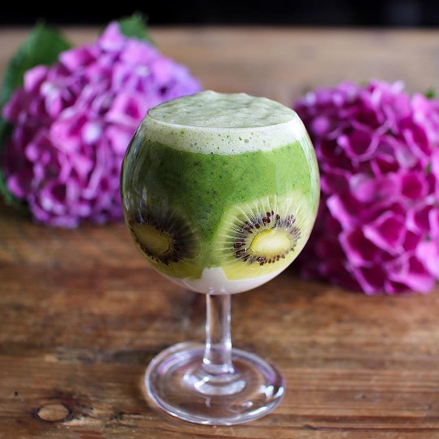 スムージーに少し慣れてきた初心者さんに調整してもらいたいレシピです。トッピングにキウイをグラスにつけてゆっくりと注いでいきましょう。