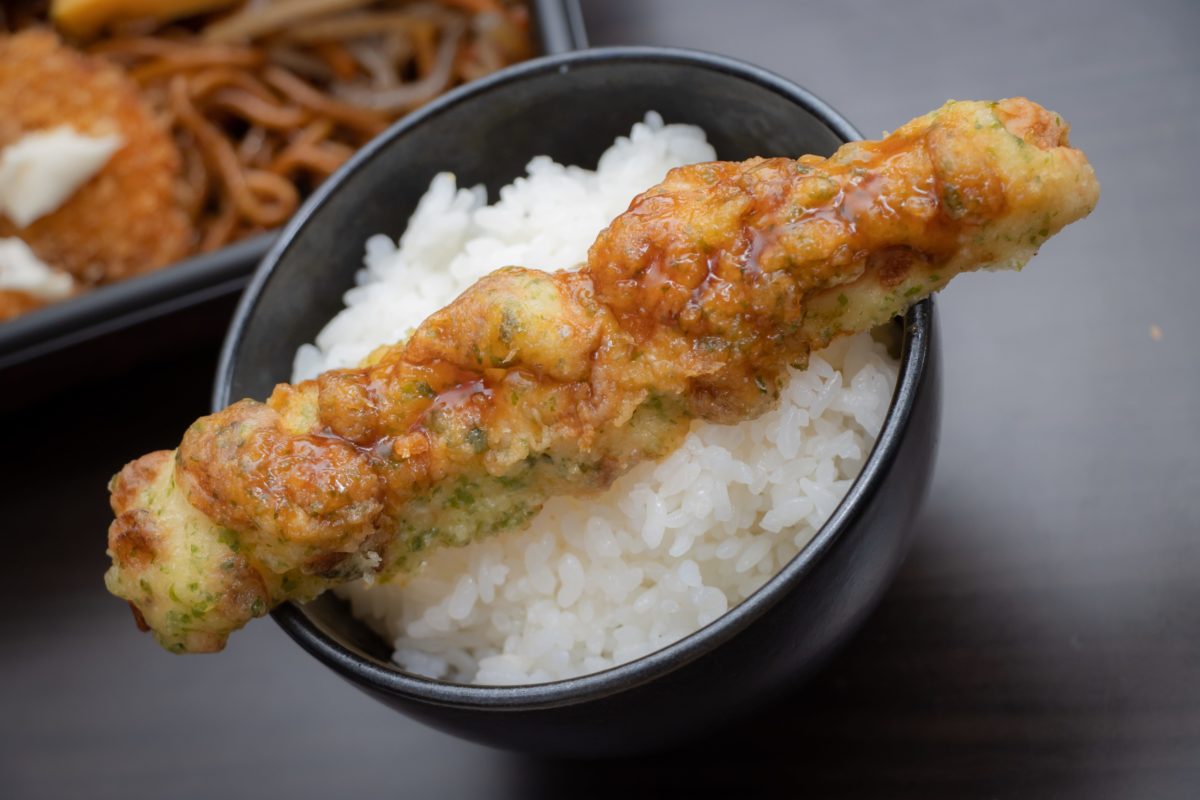 次は、人気おかずであるちくわ天。記者が想像していたちくわ天よりも大きく、茶碗からはみ出してしまった。地味にうれしい。食べてみるとかなりもっちりとした食感で、食べ応えがある。味は特出してうまい! というわけではないが、ボリュームがあるため満足値は高い。