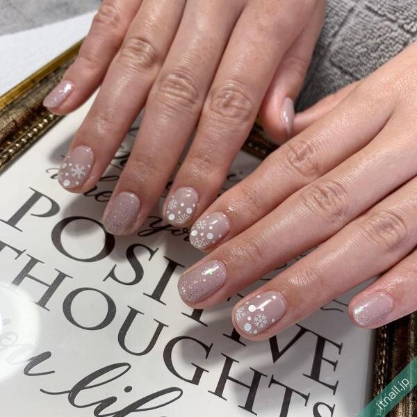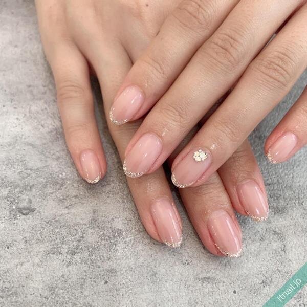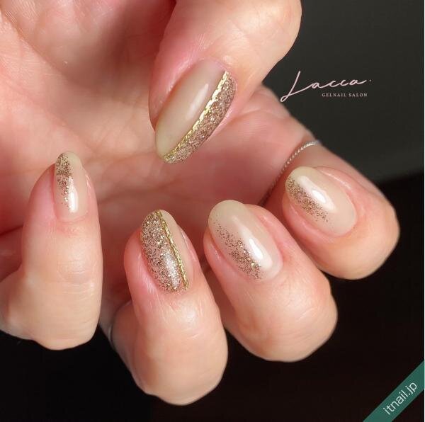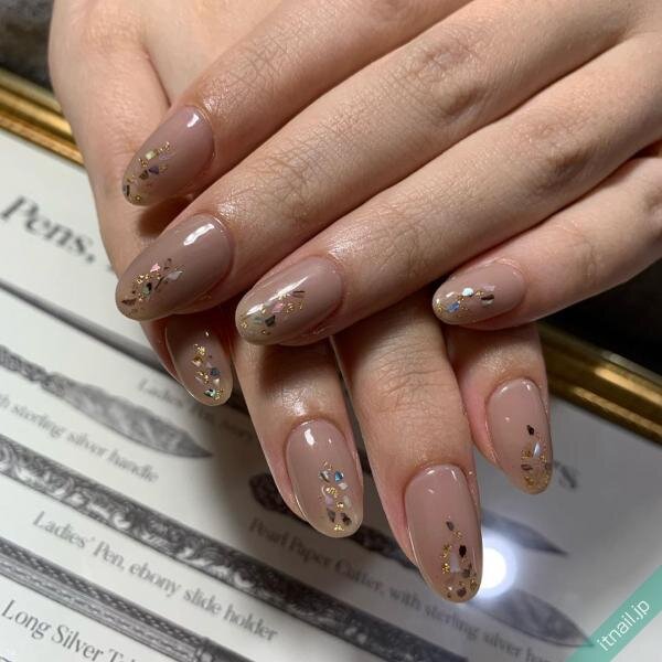 透け感のあるベージュネイルに、さりげないラメのデコレーション。こちらはあえて余白を残しているくらいが上品にまとまる秘訣です。媚びない美しさで魅了して。