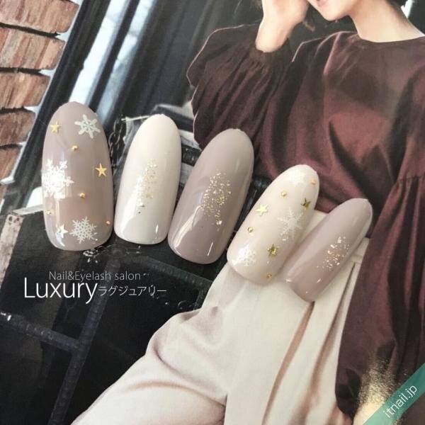 シックなモカベージュには、落ち着いた色味のシェルを合わせて。ムードたっぷりな手元にセンスの良さが際立ちます。爪の先端、中央付近に配置したバランスもこなれていますよね。