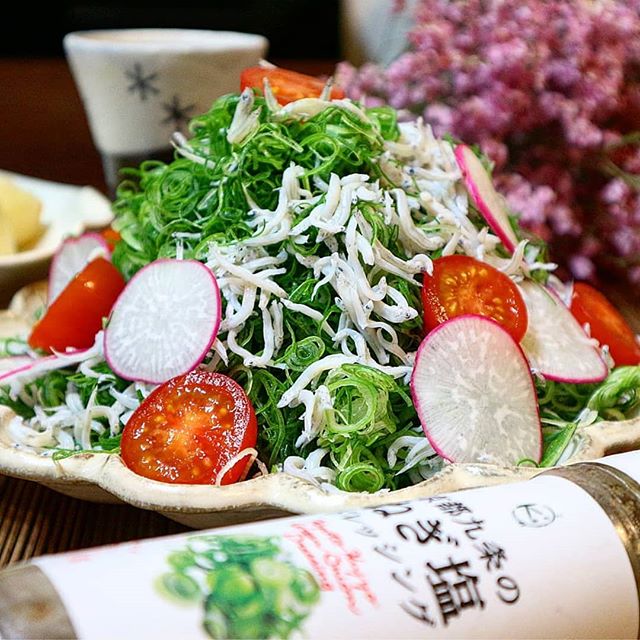 しらすの塩分が青ネギと合わさり絶妙なテイストにしてくれます。トマトやラディッシュなどもトッピングして美しくしてくださいね。