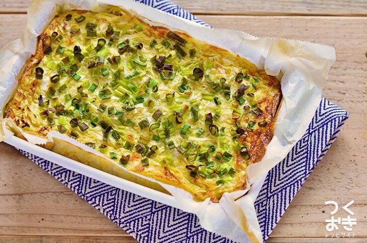 オーブンでお手軽に作れる長ネギを大量消費した料理です。長芋すりおろすことでふわふわした食感になりますが、千切りキャベツが入っているので楽しい食感になります。