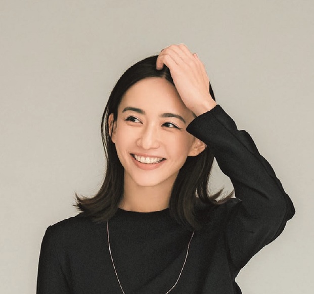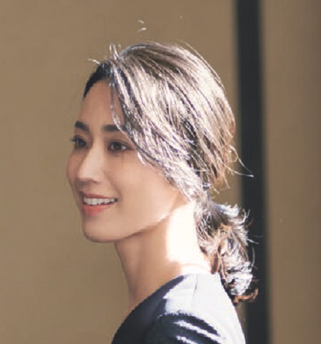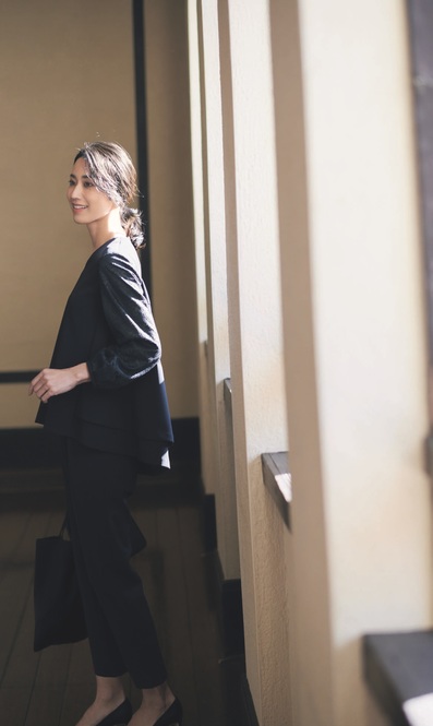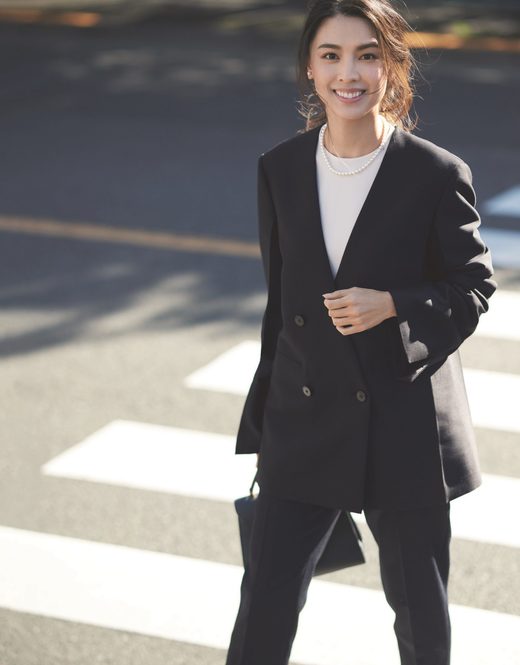 「かなり短いショートなので、前髪は分けずに流して両サイドは耳にかけました。存在感のあるフーフピアスで華やかさを。」