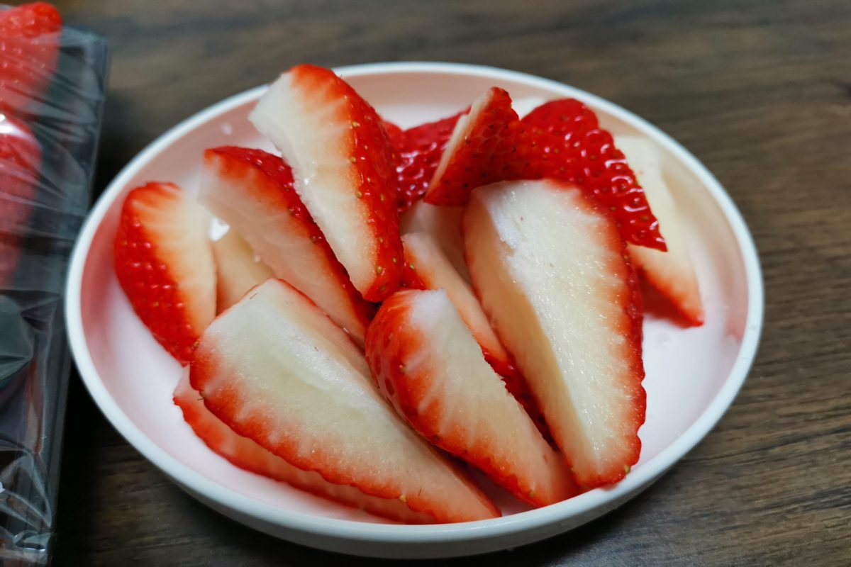 まず、外側の赤味が非常に鮮やかで、とても美しい。印象としてはあまおうより少し明るい赤色をしており、ケーキにのせたらかなり映えそうなビジュアルである。