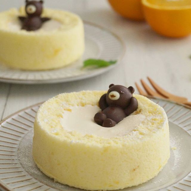 セルクルで手作りしたロールケーキにオレンジヨーグルトムースを入れてクマを投入したレシピです。