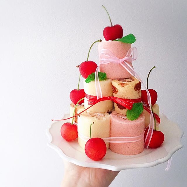 小さなロールケーキをいくつか作って、重ねていくことでアレンジできますよ。1つは水玉模様にするなどをしてアクセントをつけてみてくださいね。