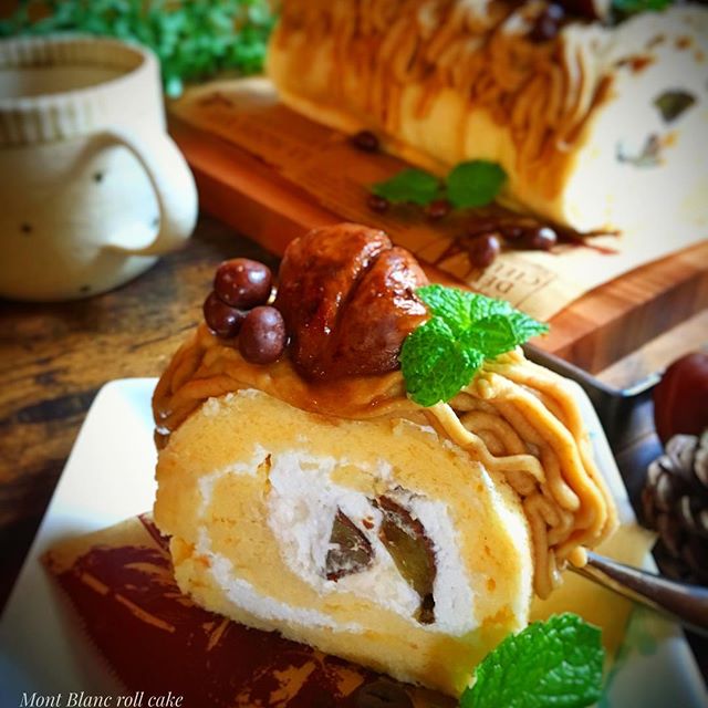このレシピはロールケーキの上にモンブランクリームをたっぷりと乗せて、渋皮煮をデコレーションしたアレンジです。
