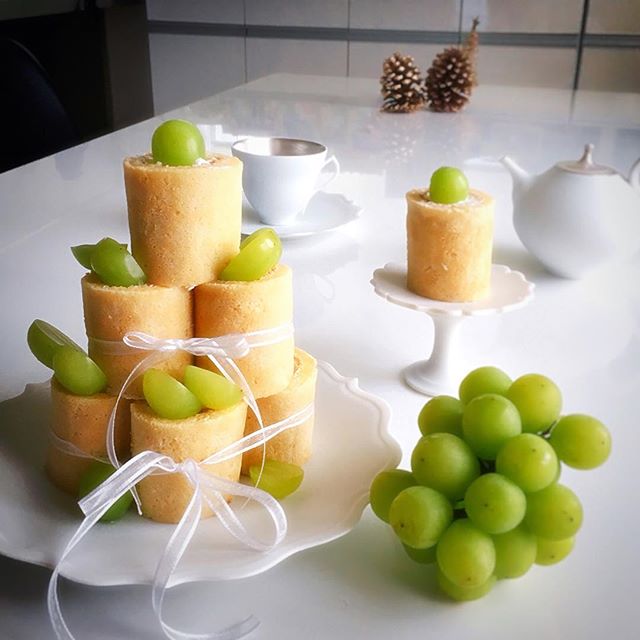 シャインマスカットをそれぞれロールケーキの上に乗せてアレンジした手作りレシピです。リボンもつけておしゃれな雰囲気にしてみてください。