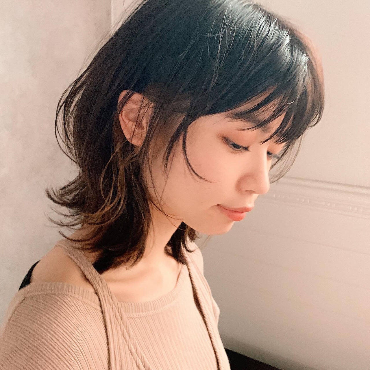 面長さんには前髪と髪全体のボリュームが大事。前髪は横幅を出すワイドバング、全体はウルフカットで毛先の動きを出しやすくすることで、顔の縦幅の長さが目立たなくなります。