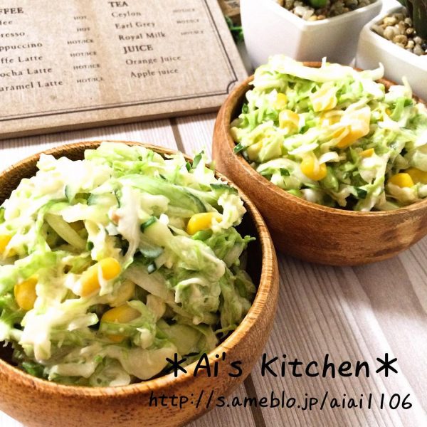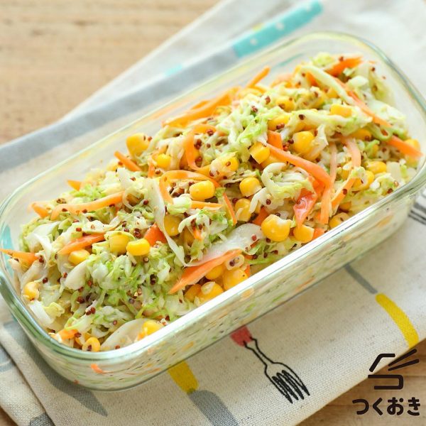 キャベツ、きゅうり、コーンを使っていますが、ブロッコリーやアスパラなど他の野菜で和えたり、ドレッシングのように温野菜にかけるのもおすすめです。