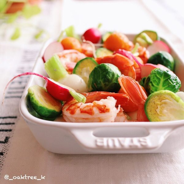 こちらのマリネサラダは芽キャベツ、海老、かぶ、ラディッシュ、バターナッツかぼちゃを使い、大きさを揃えてカラフルで華やかな見た目に仕上がっています。