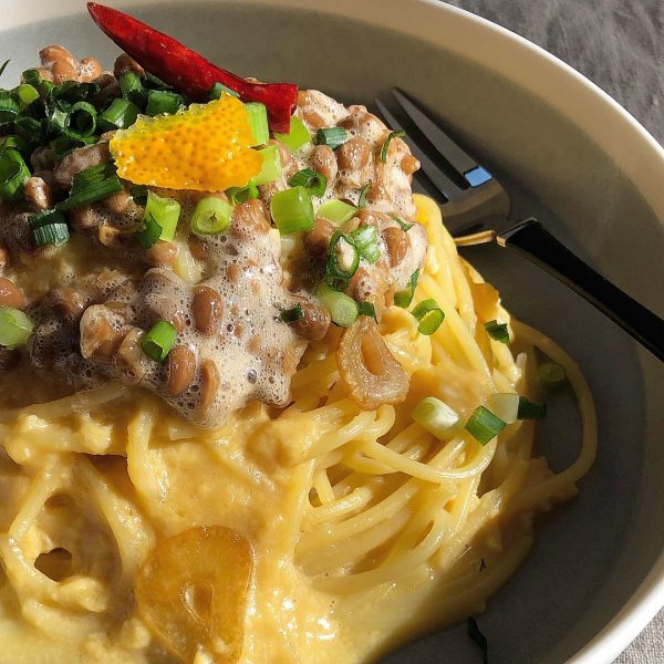 人気パスタのペペロンチーノに和風朝食の定番の生卵と納豆を合わせた、まさに朝食にピッタリのパスタ。