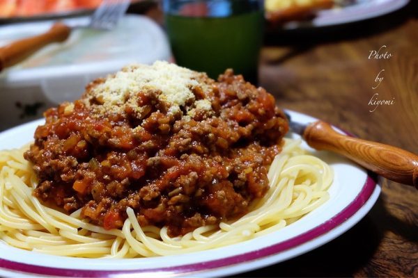 洋風パスタで定番人気はやっぱりミートソース。食べ慣れた味なので朝食でも抵抗なく食べられますよね。