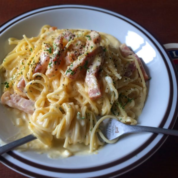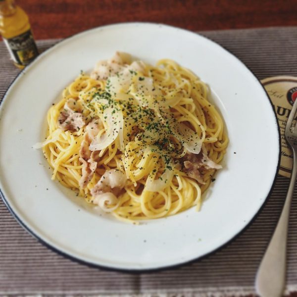 釜たまと言えばうどんを思いつきますが、パスタでも美味しく、かつ簡単に作れるので朝食におすすめ。