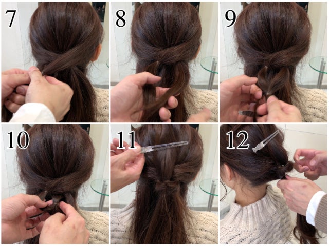 ⑩⑪ ゴム留めした毛束を逆リンパしダッカールで留めておきます。