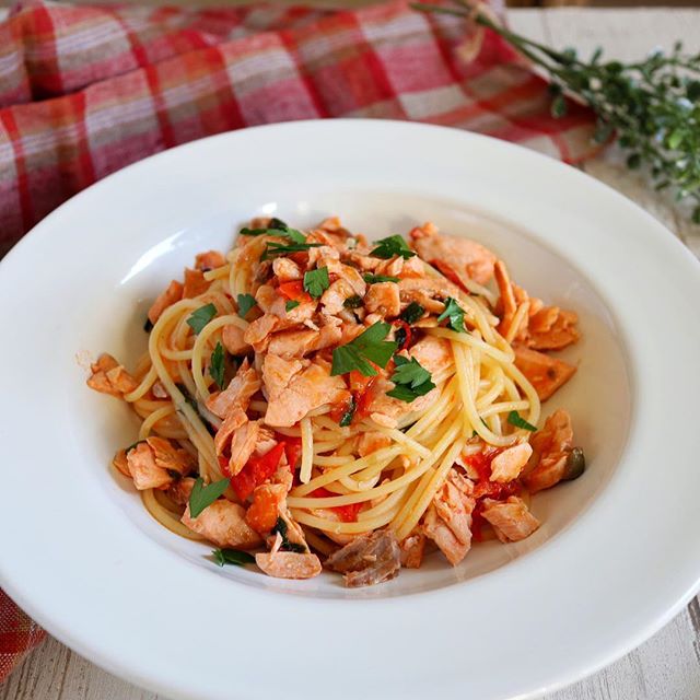 最後にご紹介するのは、鮭とトマトを合わせた人気のオイルパスタ。