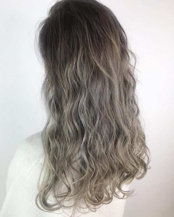 トップよりも毛先に向かって明るめにカラーを入れているのと、人気のアッシュ系のくすみのおかげで流行りのハイトーンの割に落ち着きが出るので、大人のロングさんにおすすめ。